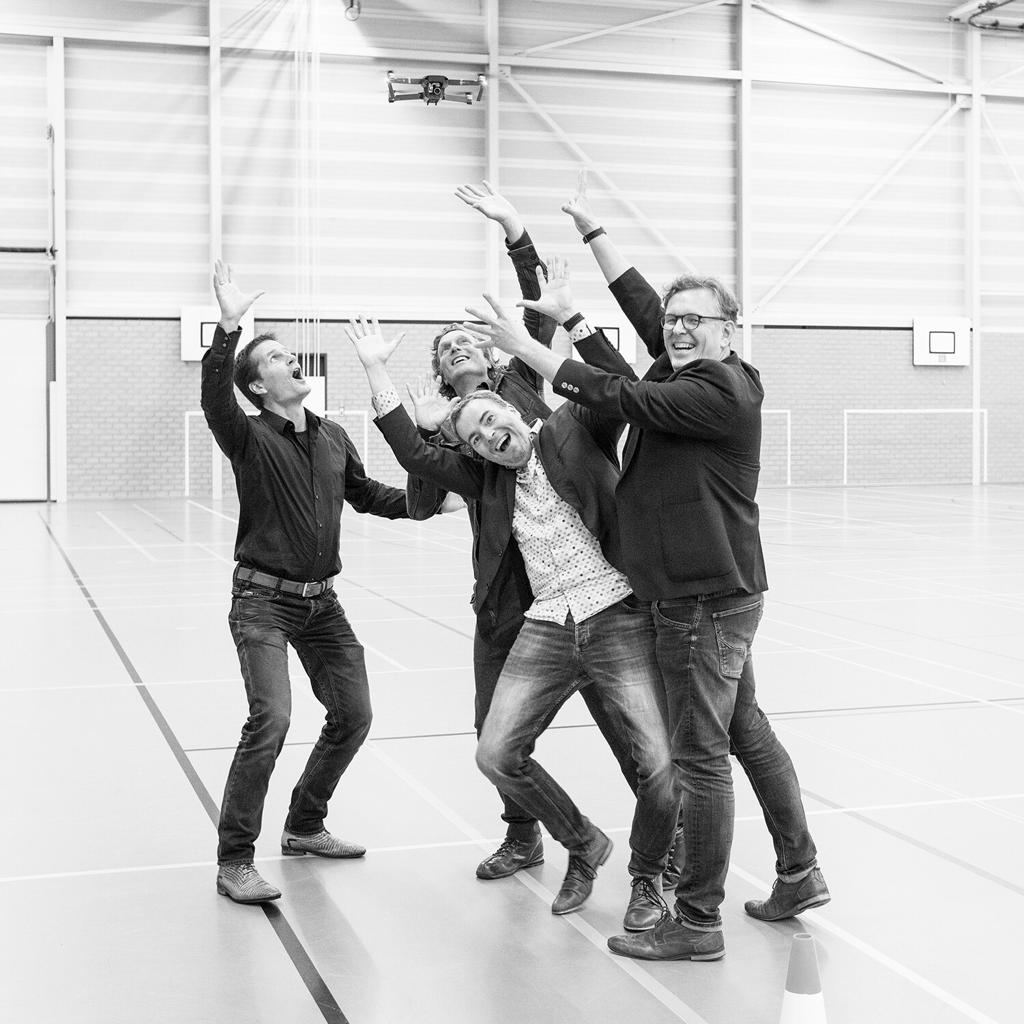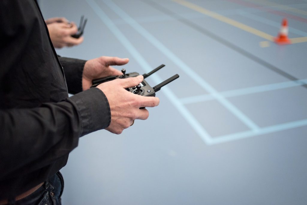 Het leukste onderdeel van je opleiding is natuurlijk het praktijkgedeelte. Tijdens onze opleiding was het slecht vliegweer (regen en vooral wind) waardoor we dat gedeelte in een gymzaal deden. Voor het eerst vlogen we met echte drones! Eerst leer je sturen, voor- en achteruit, dan zijwaarts, omhoog en omlaag, een bochtje maken. Daarvoor moet je eerst goed voelen hoe de joysticks werken op de afstandsbediening. Je bedient de sticks tussen je duim en wijsvinger, waarmee je heel precies kunt sturen. Zo’n drone reageert super gevoelig, dus je moet heel voorzichtig leren sturen.