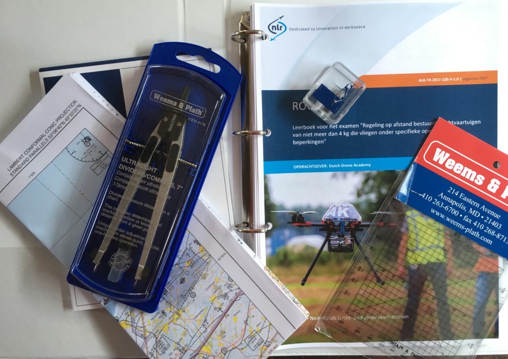 Tijdens de theorieles zaten we weer eens echt in klas. Voor ons lag de beruchte geodriehoek uit de middelbare schooltijd. Verder een passer en een grote luchtvaartkaart, die allemaal bij het opleidingsmateriaal horen. In de theorieles behandelt de docent onderdelen als navigatie, meteorologie en wetgeving. De lessen zijn vooral een voorbereiding op het theorie-examen. Daarin mag je vragen verwachten over algemene kennis van vliegtuigen, de techniek van drones, regelgeving voor drones en bijvoorbeeld het lezen van METARS; meteorologische berichtgeving van luchthavens.