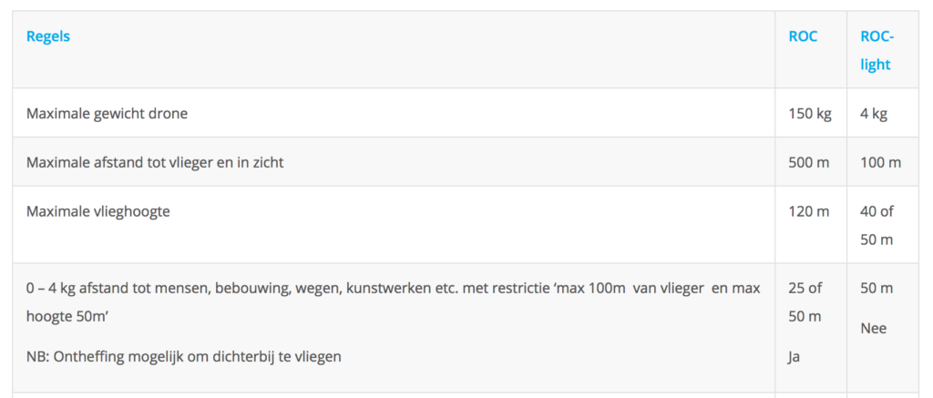 En zo zijn er nog een aantal verschillen, waarbij steeds de ROC-Light vergunning wat minder uitgebreide mogelijkheden heeft. Op de site van het Nederlands Lucht- en Ruimtevaartcentrum (waar je je dronetheorie-examen kunt doen) staat een handig overzicht van verschillen tussen ROC en ROC-Light. Hier zie je daar een stukje van, en via deze link kun je het hele overzicht bekijken.