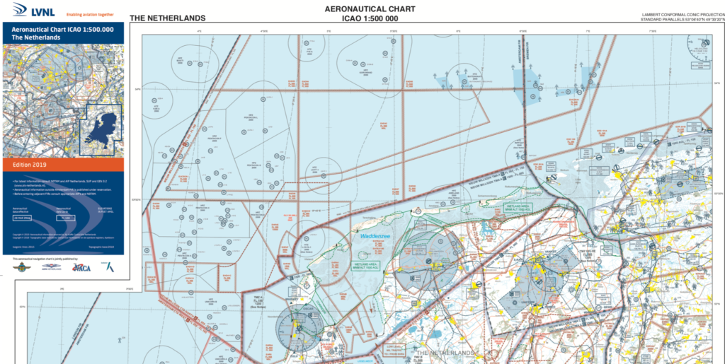 De passer en geodriehoek kwamen van pas bij het bestuderen van de luchtvaartkaart. Die aeronautische kaart staat vol met geheimzinnige codes, maar je leert ‘m snel begrijpen. De kaart gebruik je als vluchtvoorbereiding. Je moet met behulp van coördinaten een locatie op de kaart kunnen zoeken. Van die locatie moet je kunnen aangeven of je er wel of niet mag vliegen, bijvoorbeeld vanwege een militaire laagvliegzone.