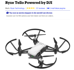 Zoals bijvoorbeeld met deze betaalbare Ryze Tello Drone powered by DJI. Voor 89 euro heb je deze oefendrone morgen in huis via Bol.com. Hij is klein, compact en licht maar voorzien van beschermende vliegfuncties, maakt foto’s met 5 megapixels en video in 720 pixels.
